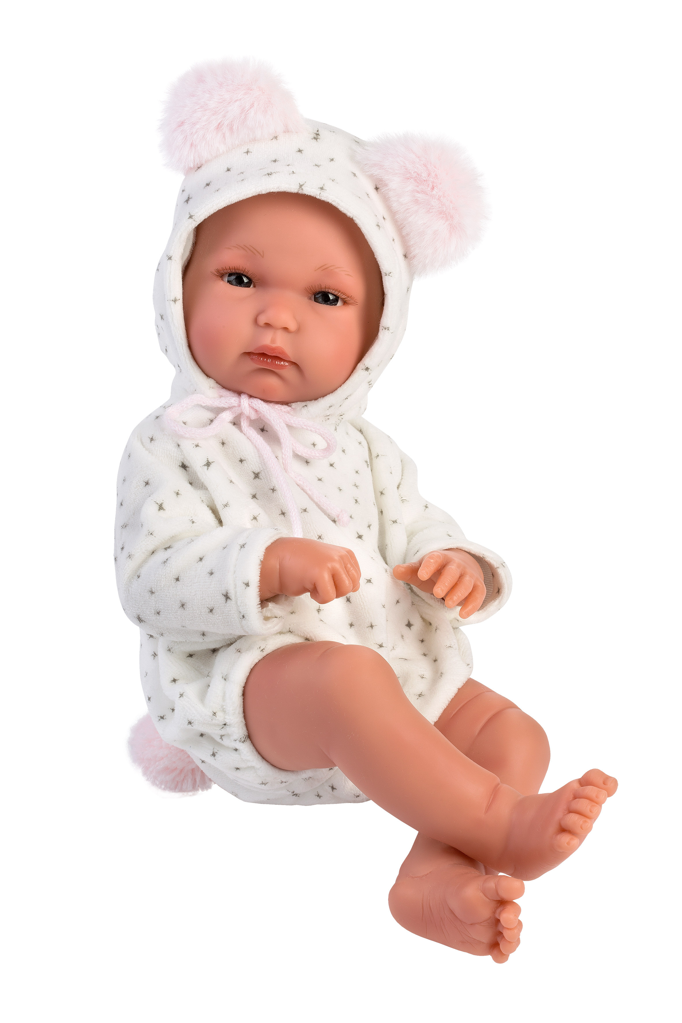 Bábika bez zvuku s gumovým telom, na ktorom je zachytený doslova každý detail detského telíčka vrátane roztomilých miminkovských záhybov a pohlavia. Cumlík v balení slúži iba ako doplnok. Veľkosť 35 cm.