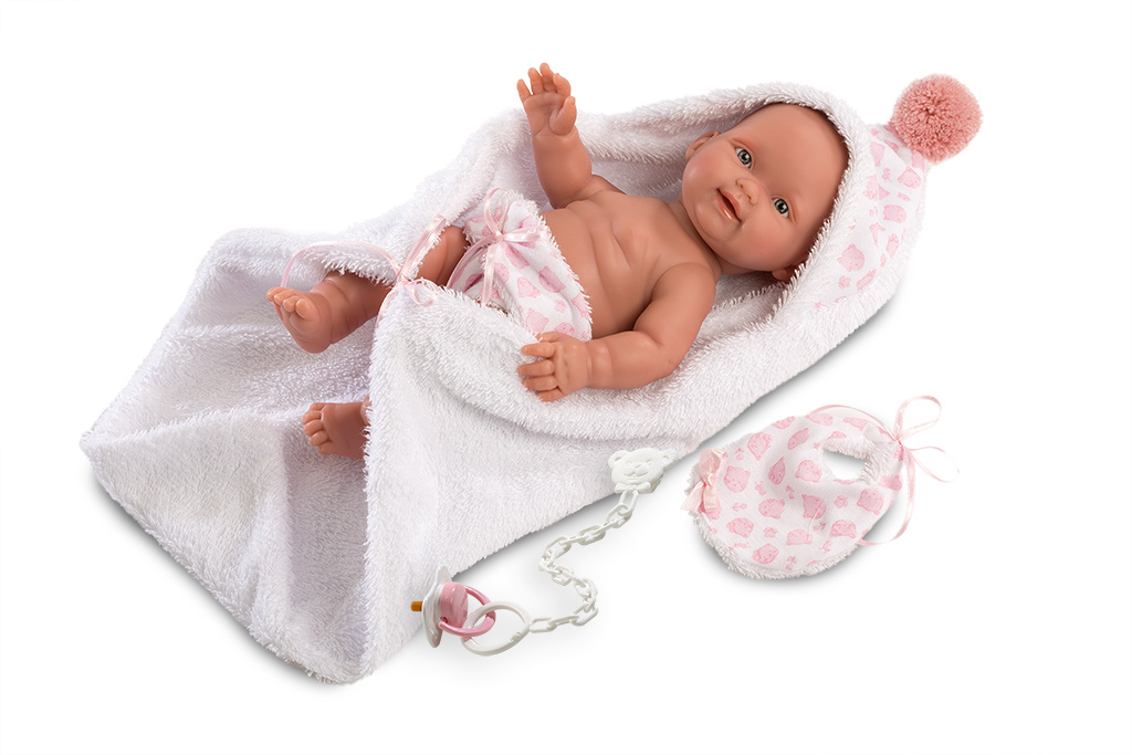 Bábika bez zvuku s vinylovým telom, na ktorom je zachytený doslova každý detail detského telíčka vrátane roztomilých miminkovských záhybov a pohlavia. Cumlík v balení slúži iba ako doplnok. Veľkosť 26 cm.