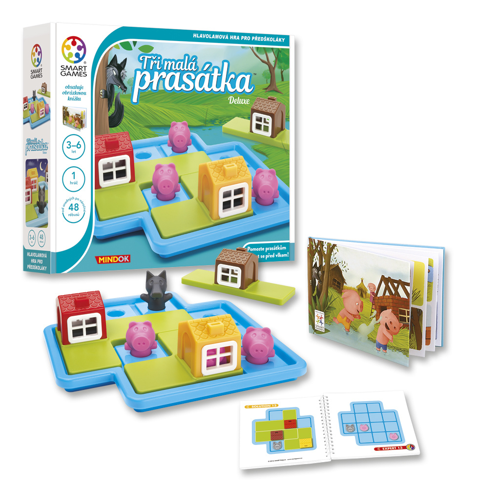 Pomôžete našim trom prasiatkam zaobstarať si vlastné útulné domčeky? A dokážete ich rozmiestniť tak, aby sa prasiatka mohli bezstarostne hrať okolo nich, vonku na čerstvom vzduchu? A čo keď sa na lúke objaví zákerný vlk? Schováte rýchlo bezbranné prasiatka do pevných domčekov? Tri malé prasiatka výborne precvičia mozgové závity vašich najmenších. V krabici nájdete 3 veľké puzzle dieliky s domčekmi, ktoré deťom padnú do ruky. Deti uchváti aj ubytovanie prasiatok v maličkých chalúpkach a cez okienka budú radi zvedavo nakukovať dovútra. Hra obsahuje 48 zadaní (24 s vlkom a 24 bez vlka), samozrejme tiež so správnymi riešeniami a naviac ešte obrázkové dobrodružstvo našich troch statočných prasiatok.