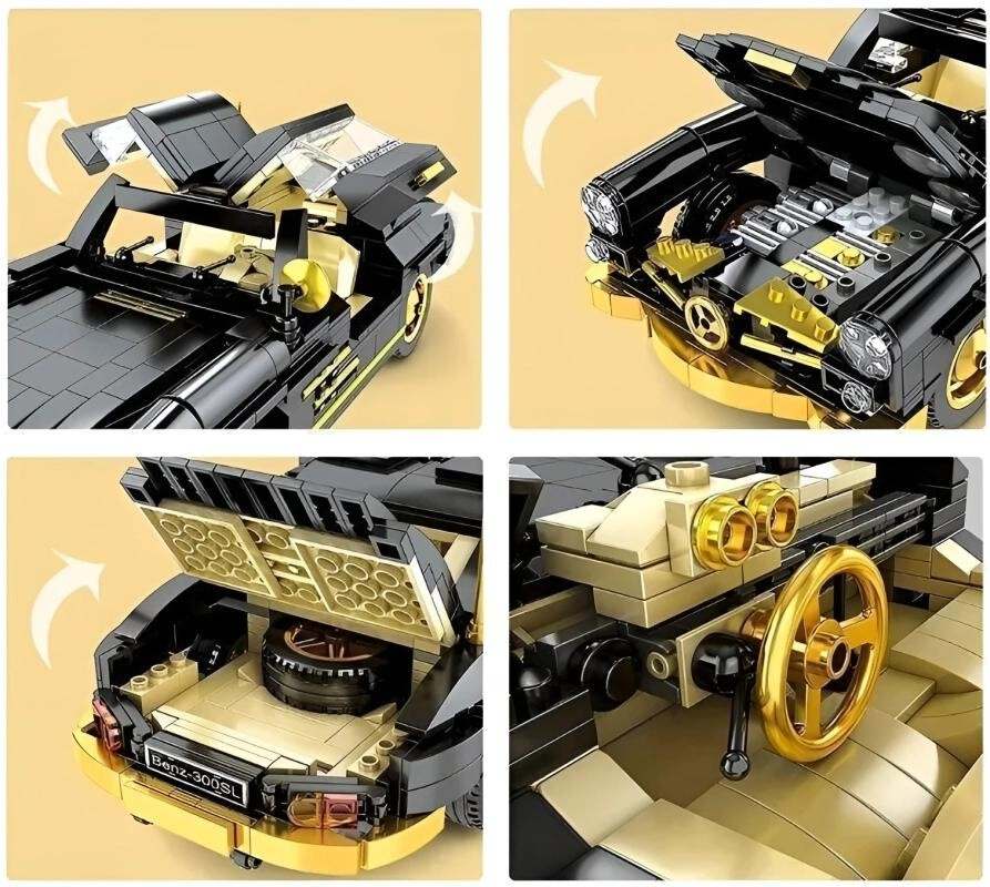 Prejdite sa históriou s modelom ikonického športového kupé 300SL, ktorý v čiernej farbe so zlatými doplnkami stelesňuje eleganciu, silu a nadčasový design. Toto klasické vozidlo zaujme každého milovníka automobilov – či už ako stavebnica na zábavné popoludnie, alebo ako štýlový výstavný kúsok.