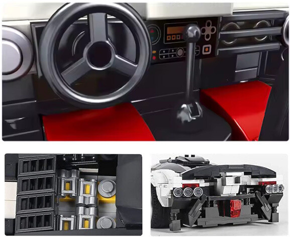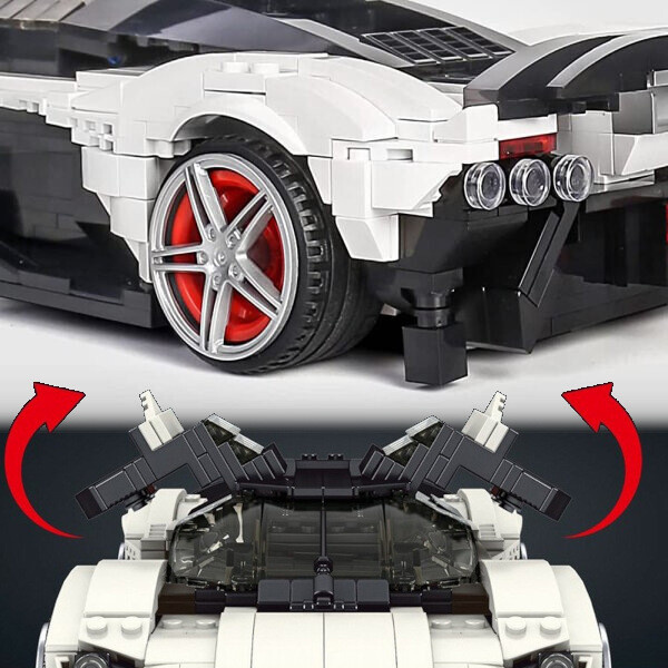 Model v bielej farbe s čiernymi doplnkami a výraznými červenými lemami kolies zaujme na prvý pohľad. Otvárateľné dvere sa dvíhajú nahor rovnako ako pri skutočných superšportoch, kryt motora je možné vyklopiť a nahliadnuť na zadnú časť vozidla, kde sa ukrýva motorový blok. Nechýbajú ani precízne zadné svetlá alebo zatmavené čelné sklo s elegantným zakrivením.