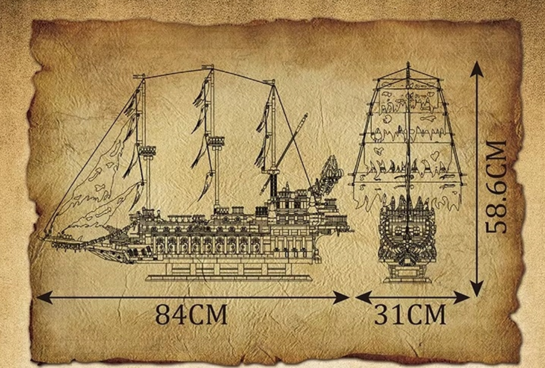 Loď si zostavíte z 4 364 dielikov podľa podrobného návodu. Výsledkom je impozantná plachetnica dlhá 84 cm, vysoká 58,6 cm a široká 31 cm. Každý detail je premyslený do posledného dieliku – od potrhaných plachiet a strážnych veží po kormidlo, diela a zadný balkón. Vďaka realistickému dizajnu a temnej atmosfére pôsobí loď ako skutočný prízrak morí.