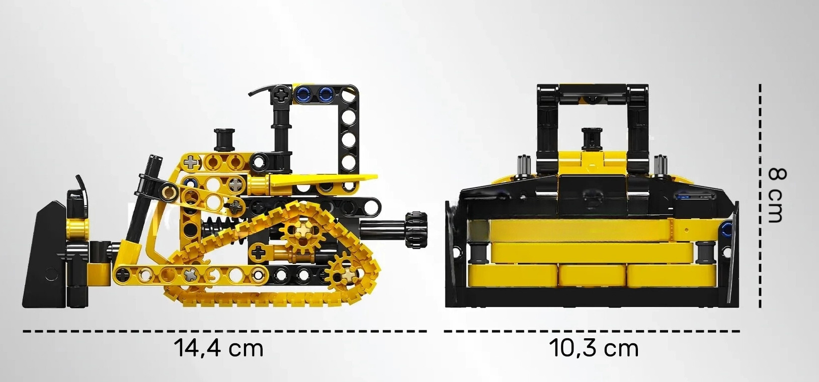 Buldozér je vybavený zdvíhacou radlicou, ktorá sa ovláda pomocou ozubeného kolieska umiestneného na zadnej časti modelu. Pásy buldozéra sú navrhnuté tak, aby bez problémov jazdili po rôznych povrchoch, vrátane tých nekĺzavých. Tento model nielenže bude baviť pri zostavovaní, ale poskytne hodiny zábavy aj pri hre.