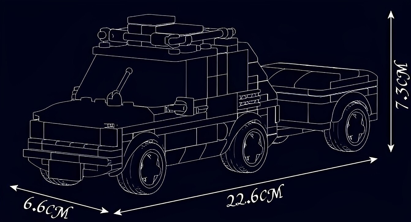 Zostavený model meria 22,6 cm na dĺžku (vrátane prívesu), 6,6 cm na šírku a 7,5 cm na výšku.
