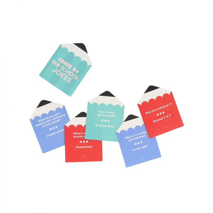 Tato přenosná sada 100 vtipů třídy A, vytištěných na kartách ve tvaru barevných tužek, je ideální nejen pro pilné školáky, co se rádi zasmějí. Sada je vhodná pro děti od 8 let a zabere průměrně 15 minut. Natištěno rostlinnými (sójovými) inkousty na FSC papíru.