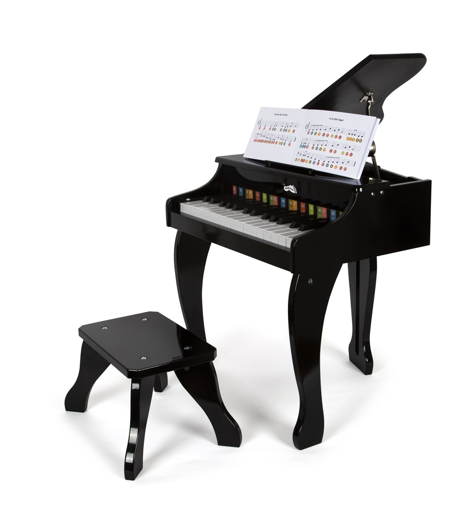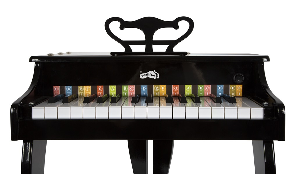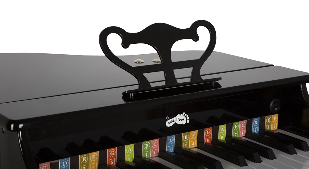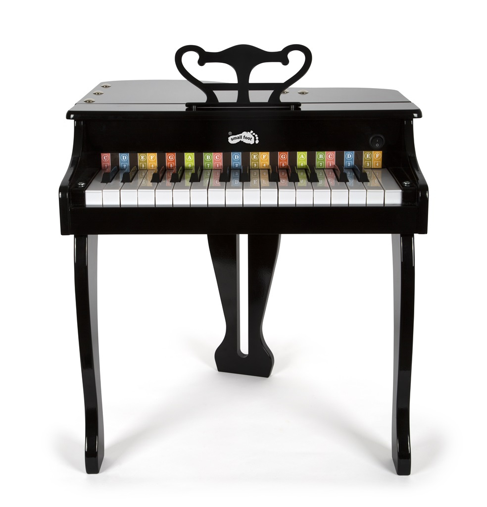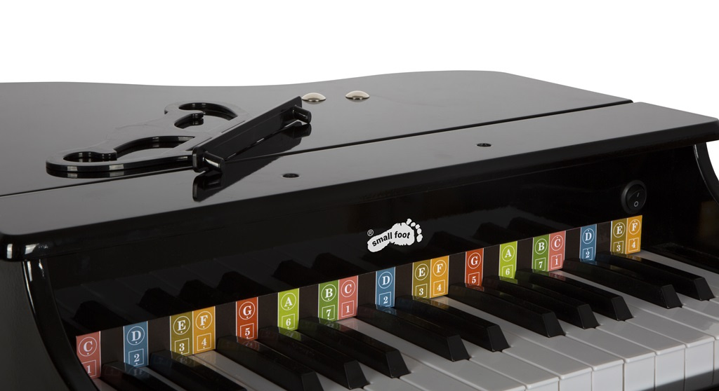 Máte doma malého hudobníka? Stále si niečo chrobáka, pohybuje sa do rytmu hudby, má rytmus v krvi? Možno prišiel čas na to, zaobstarať mu jeho prvý hudobný nástroj. Toto elektronické drevené detské klavírne krídlo v luxusnom dizajne má výbornú kvalitu zvuku a veko je možné otvoriť rovnako, ako pri skutočnom koncertnom krídle. Súčasťou je pohodlná stolička pre malého klaviristu, stojanček na upevnenie nôt a spevník. Noty v spevníku sú farebne rozlíšené a jednotlivé klávesy sú označené zodpovedajúcimi farebnými štítkami, aby sa deťom podľa nôt ľahko hralo.Nejedná sa o hudobný nástroj, ale iba o hračku.