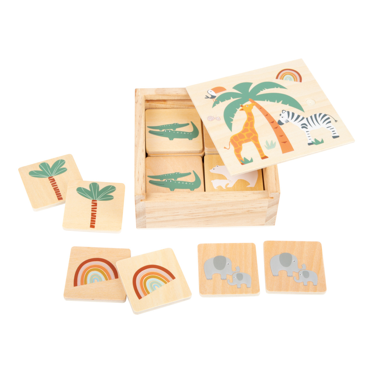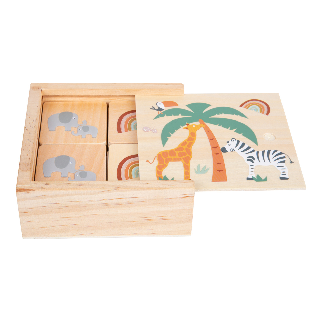 Safari přímo v dětském pokojíku! Abyste našli všech 14 dvojic obrázků budete potřebovat dobrou pamět a soustředěnost. Malé dřevěné dílky s krásnými ilustracemi safari v trendy barvách upoutají pozornost každého dítěte. Budou se chtít dozvědět více o tomto zvířecím světe. Nejen, že si děti při hraní pexesa procvičí pamět, ale také se naučí pojmenovat nová zvířata. Pexeso je uloženo v dřevěném boxu, takže je perfektní i na cesty.