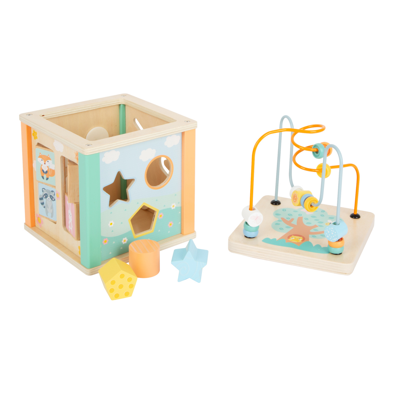 Skladajte, strkajte, klopkajte, otáčajte! Môžete sa hrať zo všetkých piatich strán! Drevená motorická kocka ponúkne zábavu aj najmenším deťom. Perličkové bludisko, otáčajúce sa obrázky, otvory s kockami na vkladanie, ozubené kolieska – všetky tieto prvky deti naučia rozoznávať farby a tvary a tiež precvičia ich jemnú motoriku. Trendy pastelové farby, roztomilé zvieracie motívy a hravé detaily, táto kocka bude pravým pútačom v každej detskej izbičke. Vrchné veko môžete odňať a uložiť do kocky hore nohami, ušetrí vám tak kúsok miesta. Krásna motorická kocka je súčasťou produktového radu „Pastel“ a zaujme vysokým viditeľným podielom dreva a moderným zafarbením v pastelových farbách.