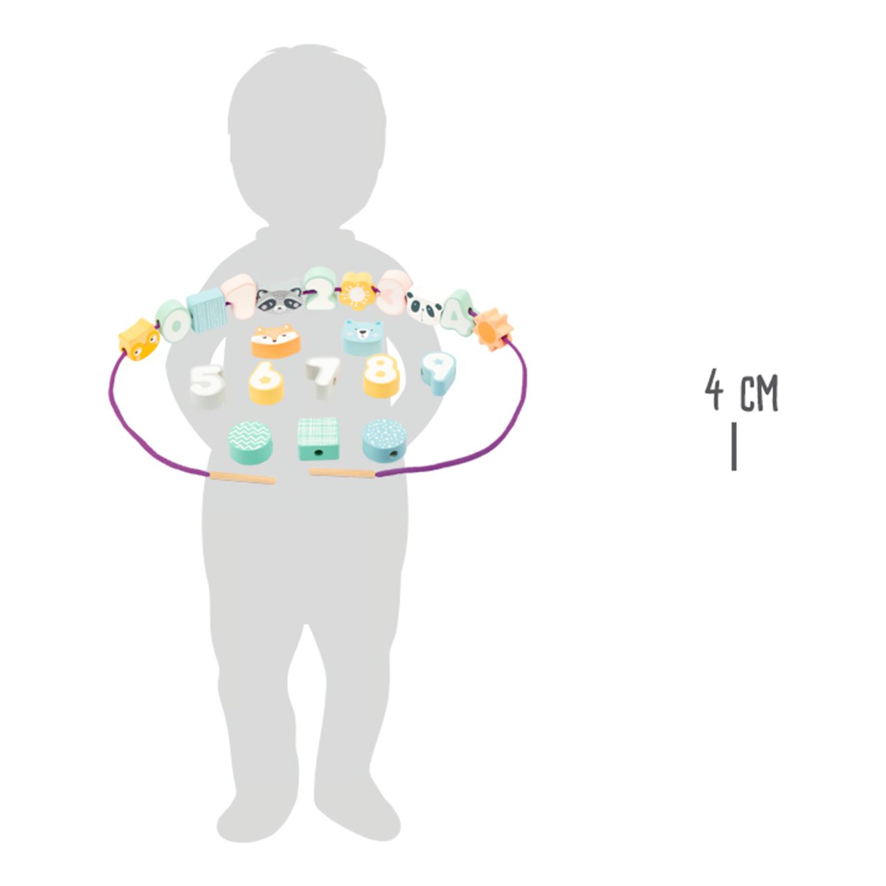 Rozměry dílku: cca 4x4x2 cm Délka šňůrky:100 cm, Ø 0,5 cm Věk: 2+ Materiál: dřevo Obsahuje 22 dílků