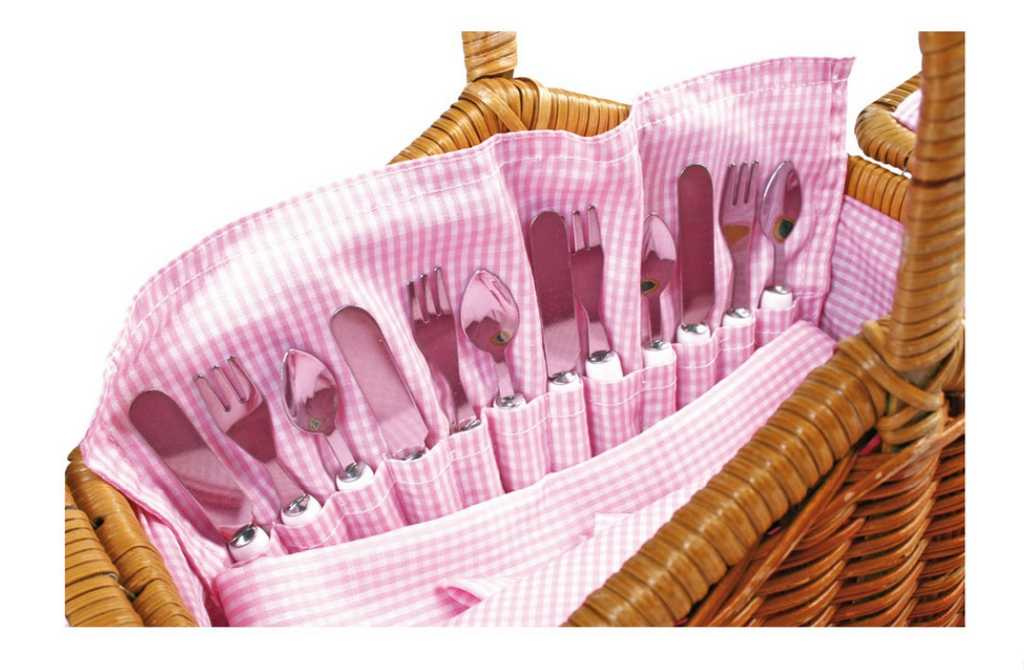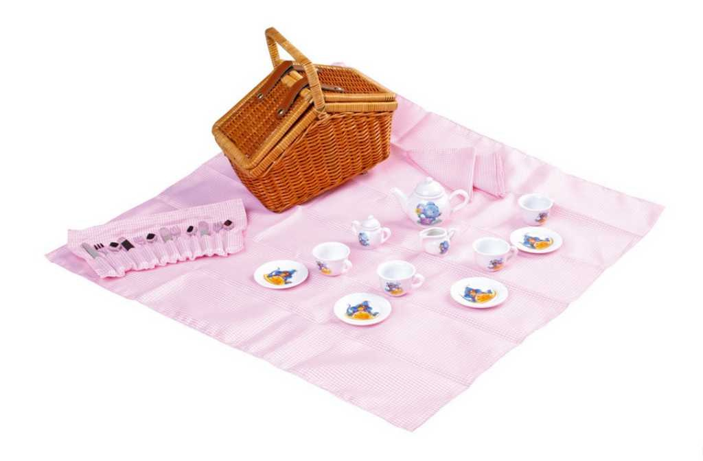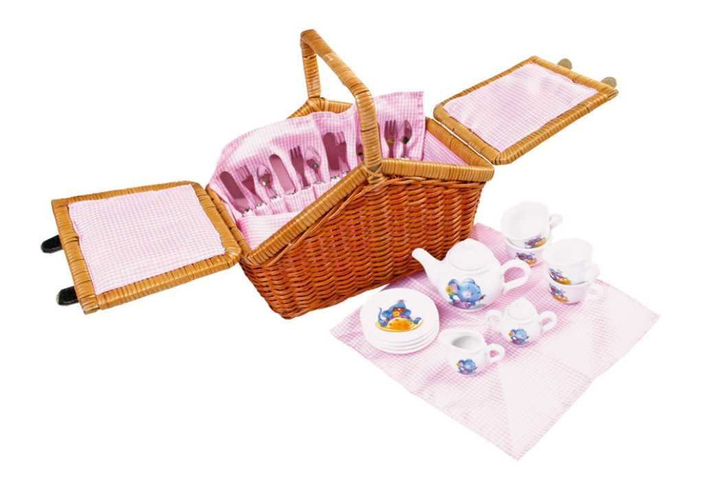 Ať už na zahradě nebo v parku pojďte si vychutnat čaj s piknikovým košem Romantik. Košík vyroben z umělého proutí, obsahuje celkem 30 částí. Sada se skládá ze čtyř talířů, šálků, podšálků, vidliček, lžic a nožů a také konvice na kávu, cukřenky a konvičky na mléko. Nádobí je porcelánové, příbory jsou z kovového materiálu. Součástí je i ubrous v růžové barvě.