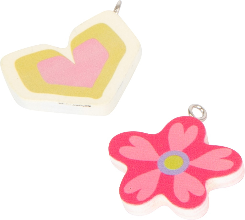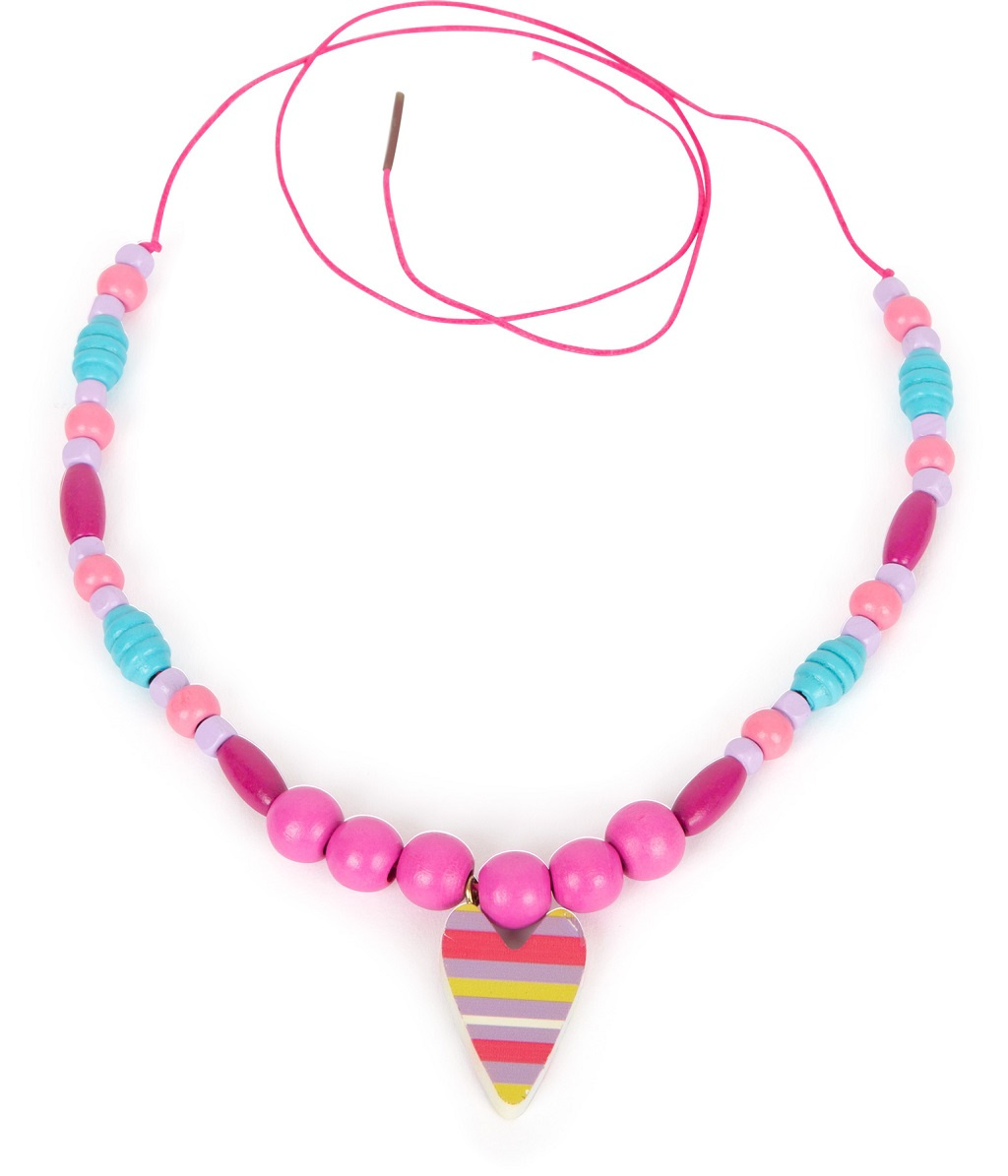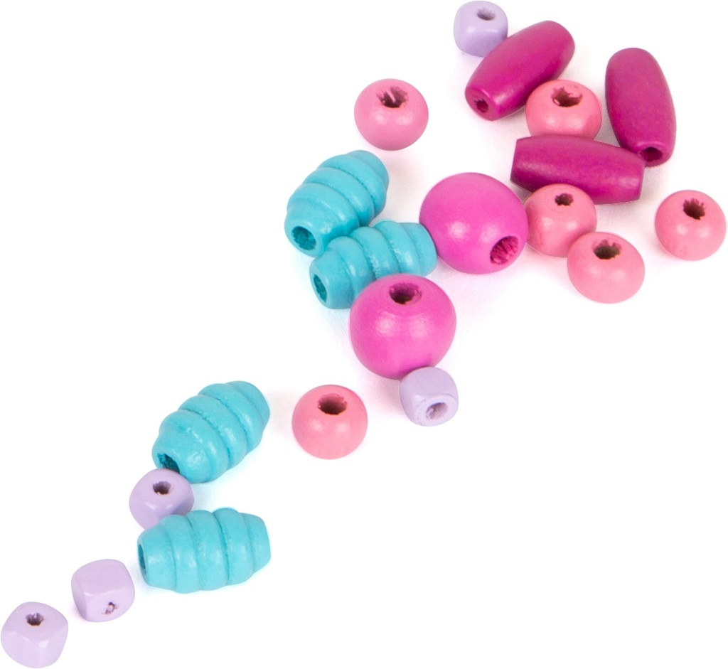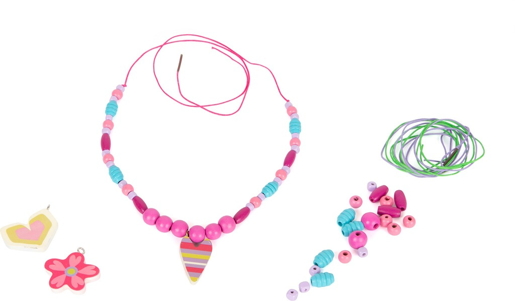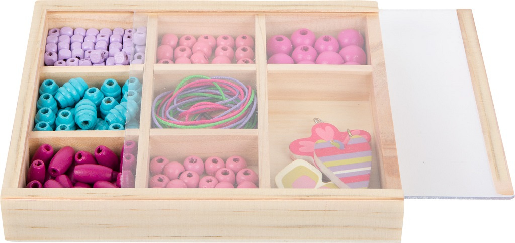 Vyrobte si své šperky s touto sadou korálků v pěti různých barvách a tvarech. Korálkový set doplňují tři přívěsky s různými motivy v hravém designu a tři barevně sladěné šňůry. Vše je uloženo v dřevěné krabici. Navlékáním korálků je podporována jemná motorika dětí.
