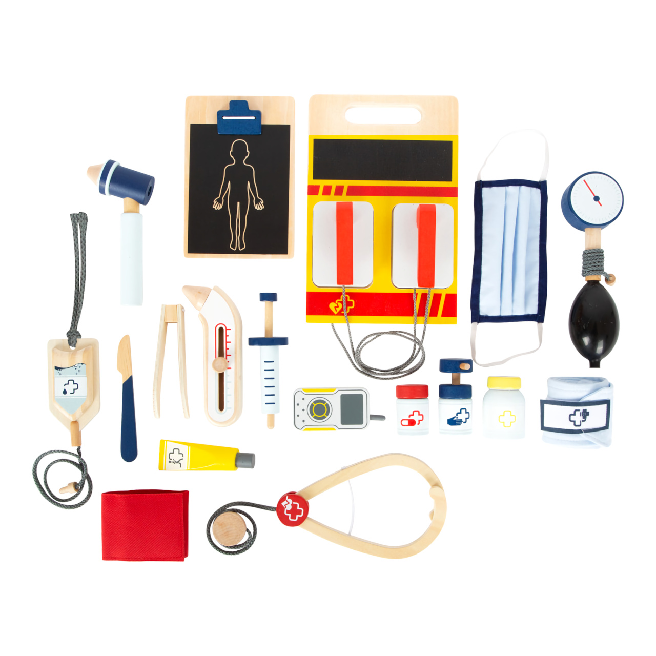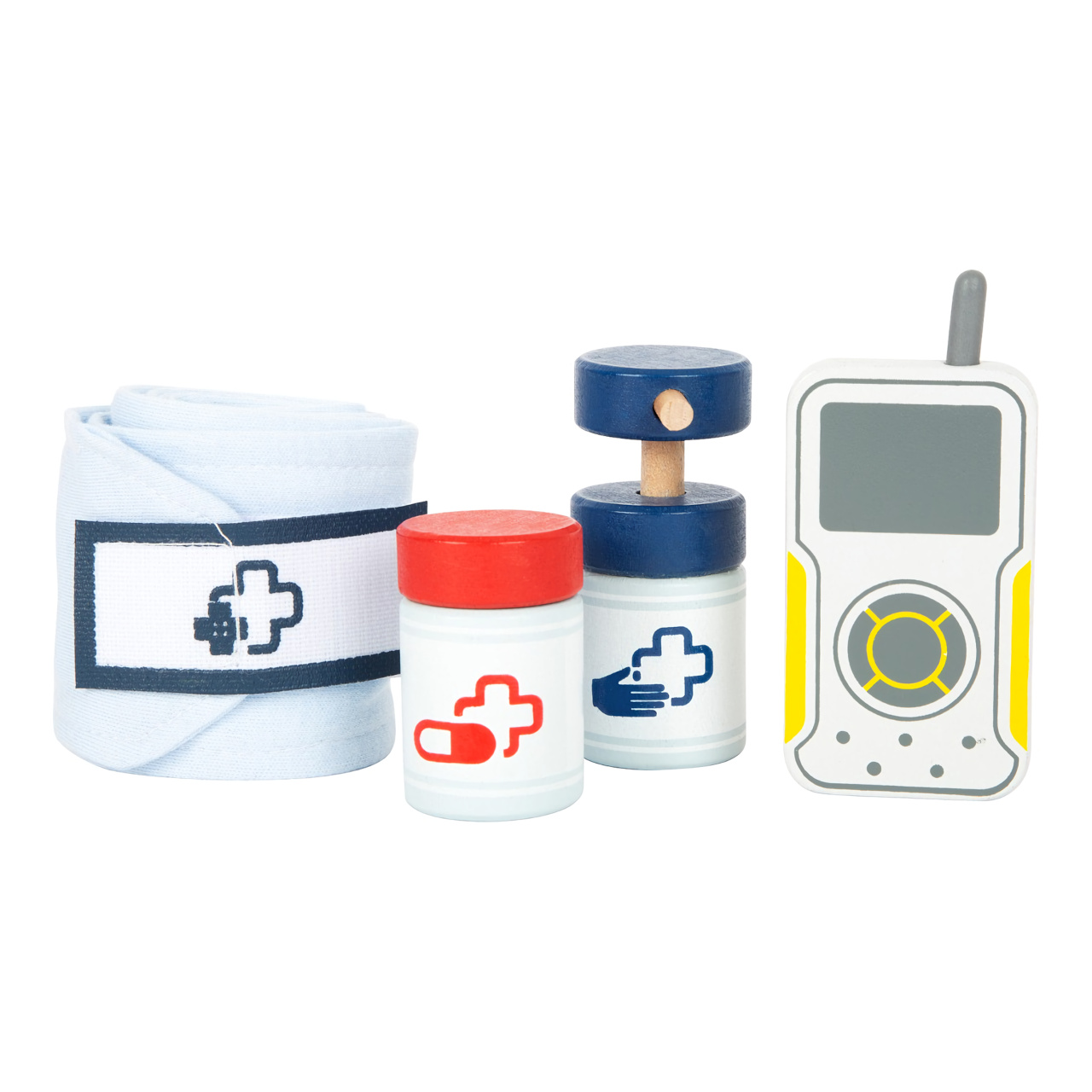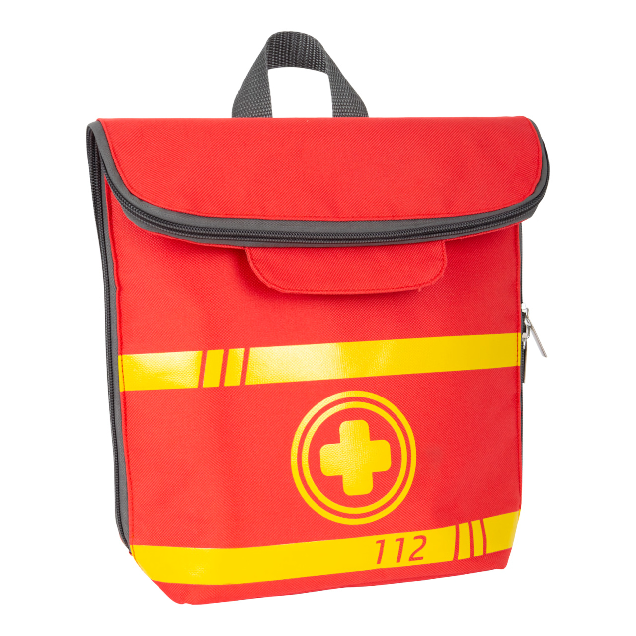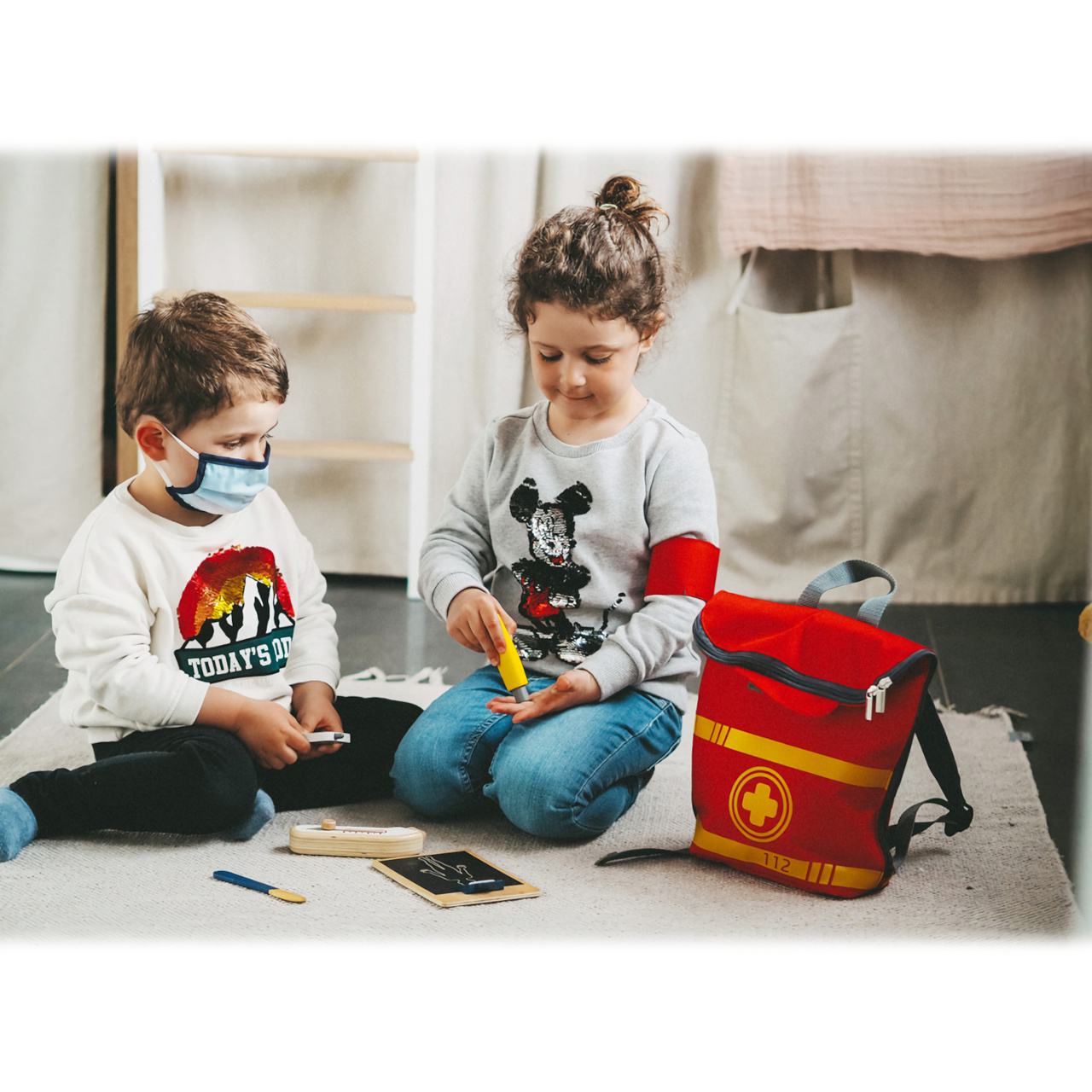 Vše pro naléhavé případy! Tento realistický batoh pro záchranáře má jasné barvy, nastavitelné popruhy a mladí záchranáři v něm najdou všechny „opravdové“ lékařské pomůcky. Dvojitý zip a uvnitř elastické kapsy nabízí mnoho úložného prostoru a rychlý přístup k záchranářským pomůckám z pevného dřeva. Nejlepšími doplňky jsou zřejmě tlakoměr s manžetou a balónkem, otoskop s lupou a defibrilátor s tabulkou pro křídu. Tento inovativní a obsáhlý set lékařských hraček obsahuje mnoho „opravdových“ lékařských nástrojů a přístrojů, s kterými si děti opravdu vyhrají, to vše v jednom batohu. Dále v batohu najdete teploměr, dětské textilní roušky, ampule s otvorem pro vložení stříkačky pro případ nouze, dezinfekční sprej s pumpičkou, infúzi, náplasti na suchý zip, stetoskop, injekční stříkačku s pohyblivým mechanismem, skalpel, pinzetu a rádio. S těmito pevnými hračkami mohou děti objevovat a zkoušet, jaké je to být záchranářem. Ilustrace na lékařských pomůckách dětem poradí rozeznat nástroje a také jim možná zjednoduší jejich použití.