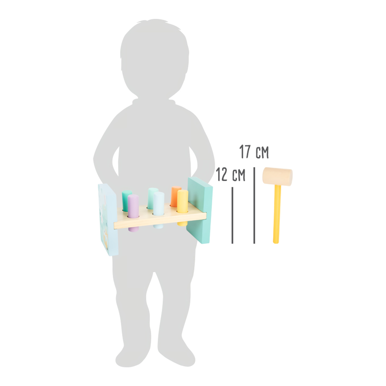Rozměry: 22x9x12 cm Rozměry kladívka: 17x5,5x3,5 cm Věk: 18m+ Materiál: dřevo