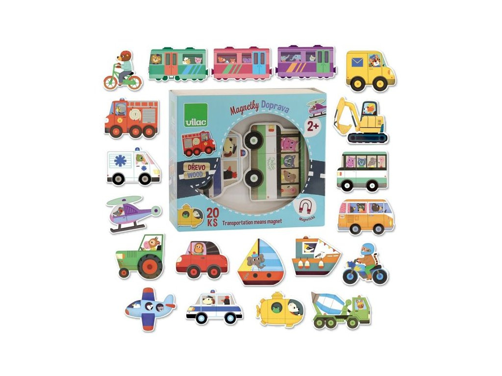 Sada dvaceti dřevěných magnetů s motivy dopravních prostředků.