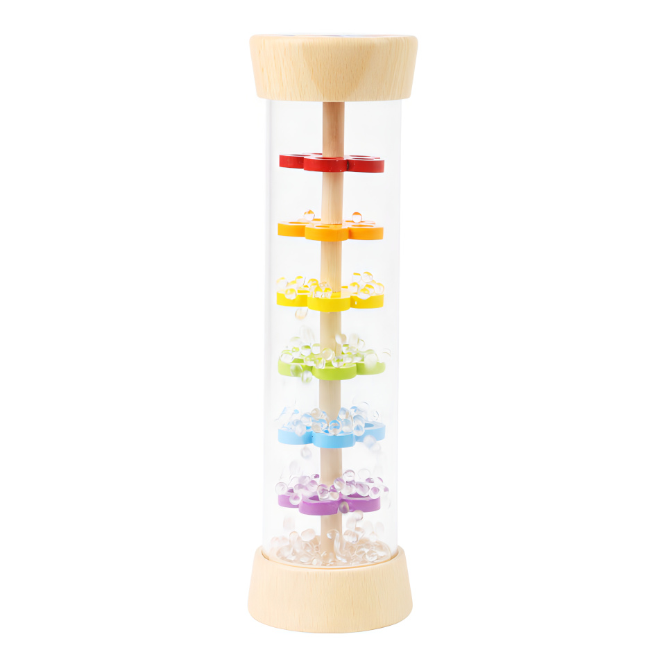 Tak přesně takhle zní déšť! S dešťovou holí můžete imitovat zvuky jemného deště. Můžete ji použít jako chrastítko, rytmickou hračku. Tělo hračky je průhledné, můžete tak pozorovat jak se kuličky pohybují přes zábrany ve tvaru květin.