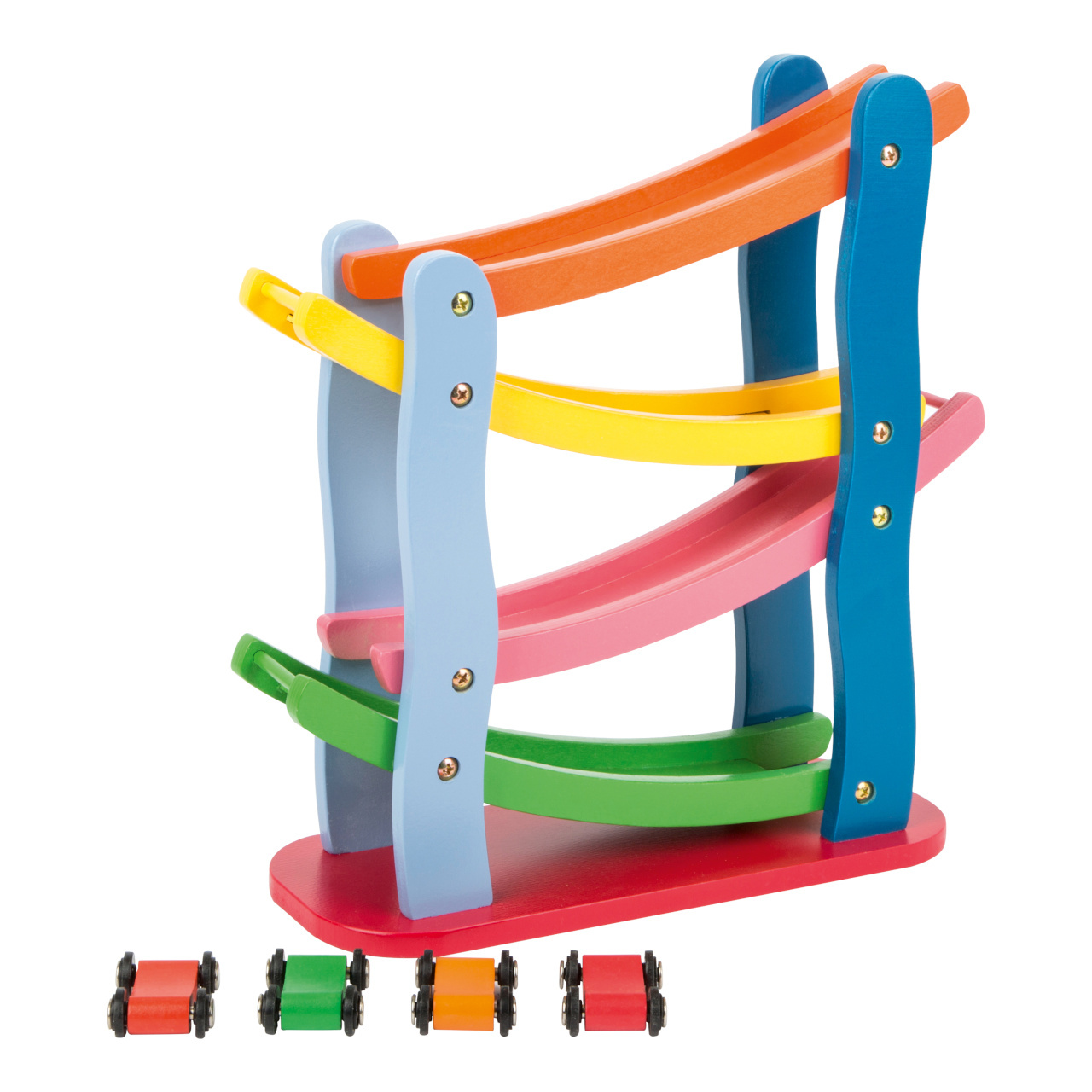 Tato závodní dráha z barevného dřeva je „Formulí 1“ mezi kaskádovými dráhami. Čtyři malá barevná auta uhánějí po stabilní dřevěné závodní dráze a přitom dělají kotrmelce. Dřevěná auta se snadno drží a jsou připravena na další rychlý sjezd.