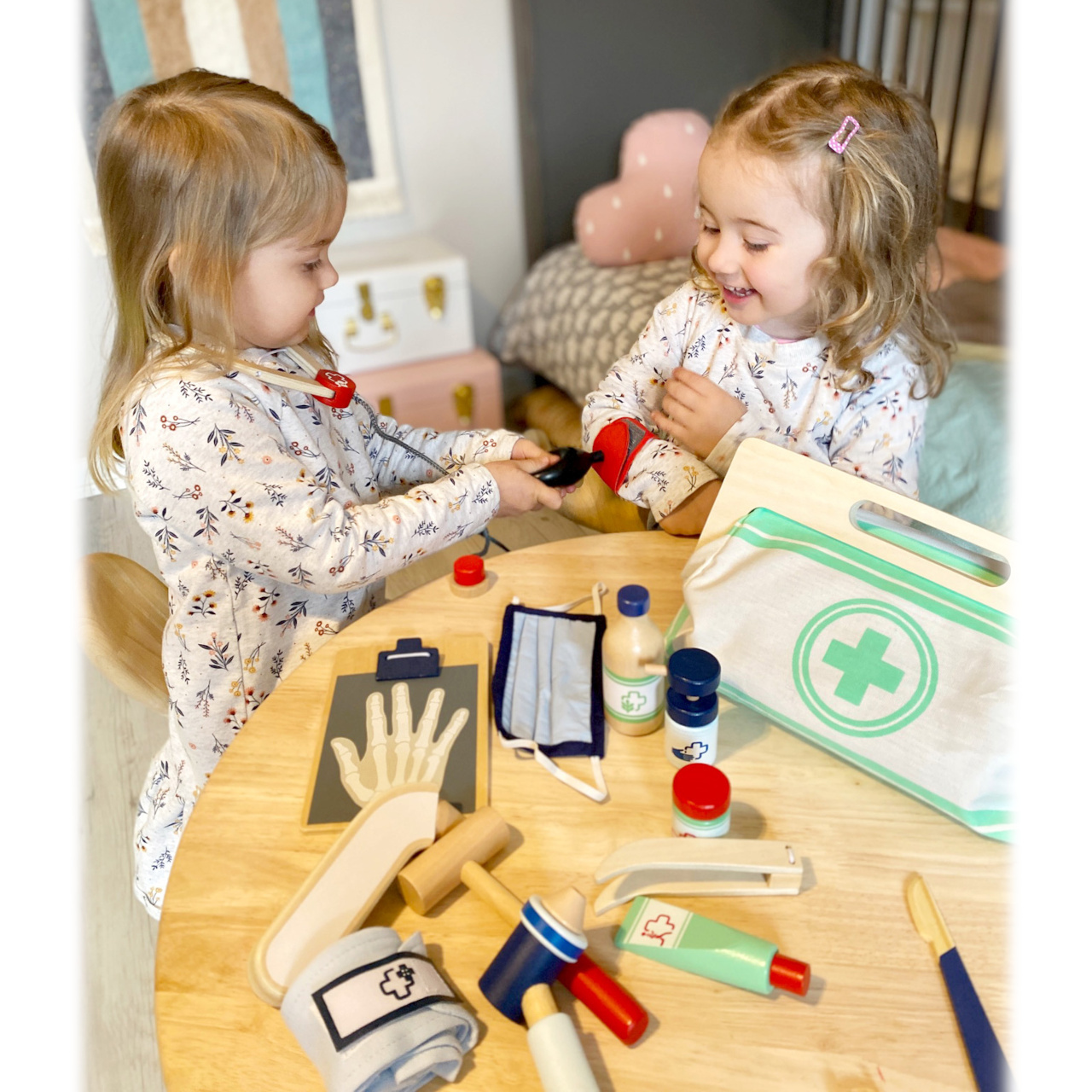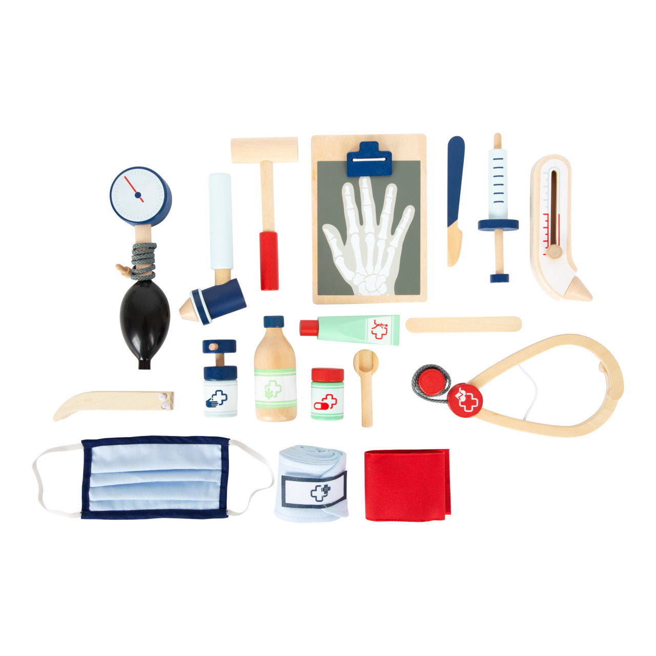 S touto standardní lékařskou brašnou budou mladí nadějní lékaři perfektně vybaveni. Brašna je vyrobená z měkkého textilu, je pěkná na pohled a také velmi funkční. Lze lehce otevřít díky magnetům, je vyrobena ze dřeva. Uvnitř brašny najdete všechno vybavení pro představivé ošetření pacientů: stetoskop, teploměr, stříkačku a mnoho dalšího – vše vyrobeno z pevného dřeva! Nejlepšími doplňky jsou zřejmě tlakoměr s manžetou a balónkem a otoskop s lupou. Tento obsáhlý set lékařských hraček obsahuje mnoho „opravdových“ lékařských nástrojů a přístrojů, s kterými si děti opravdu vyhrají. Ilustrace na lékařských pomůckách dětem poradí rozeznat nástroje a také jim možná zjednoduší jejich použití.