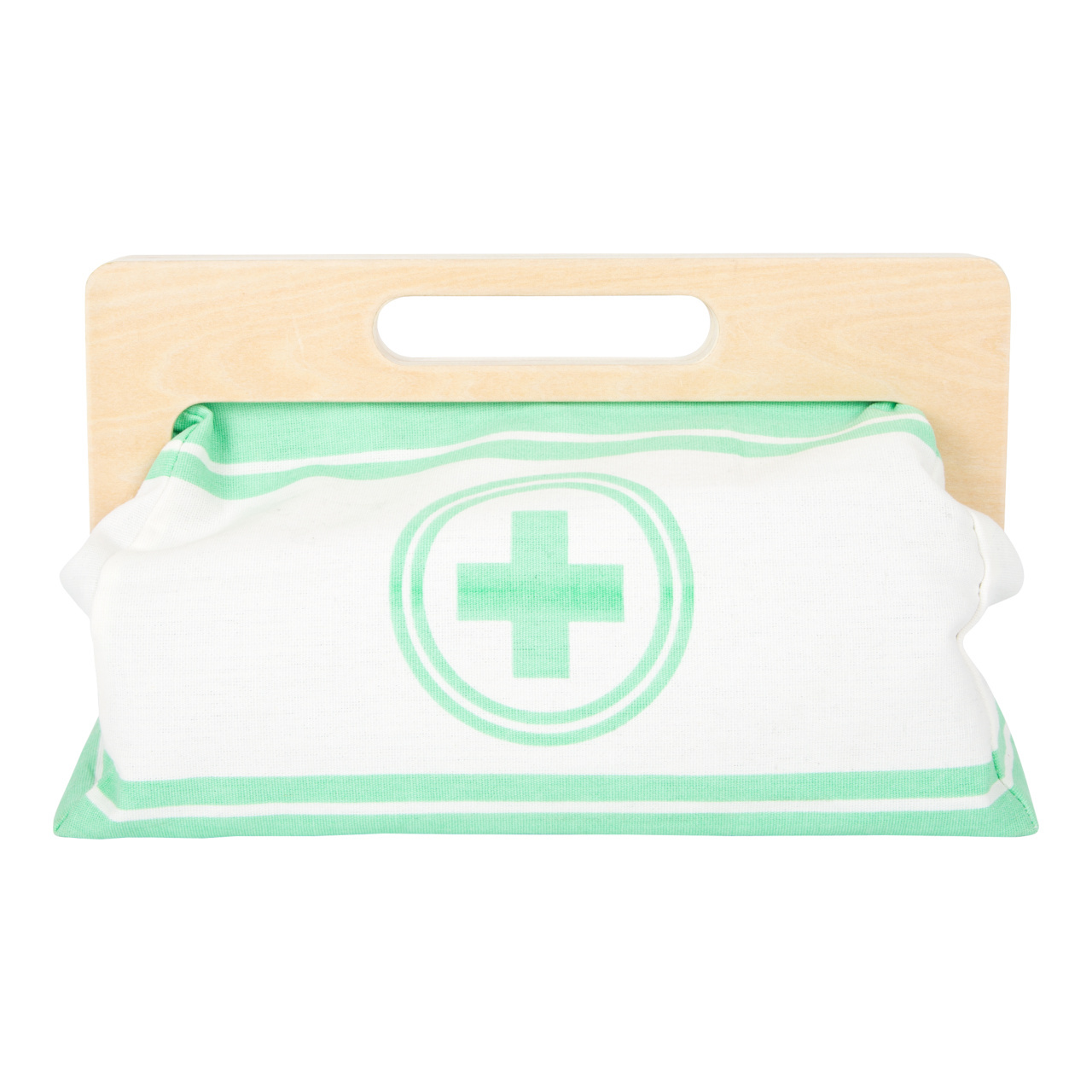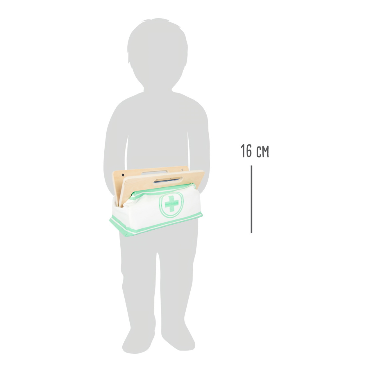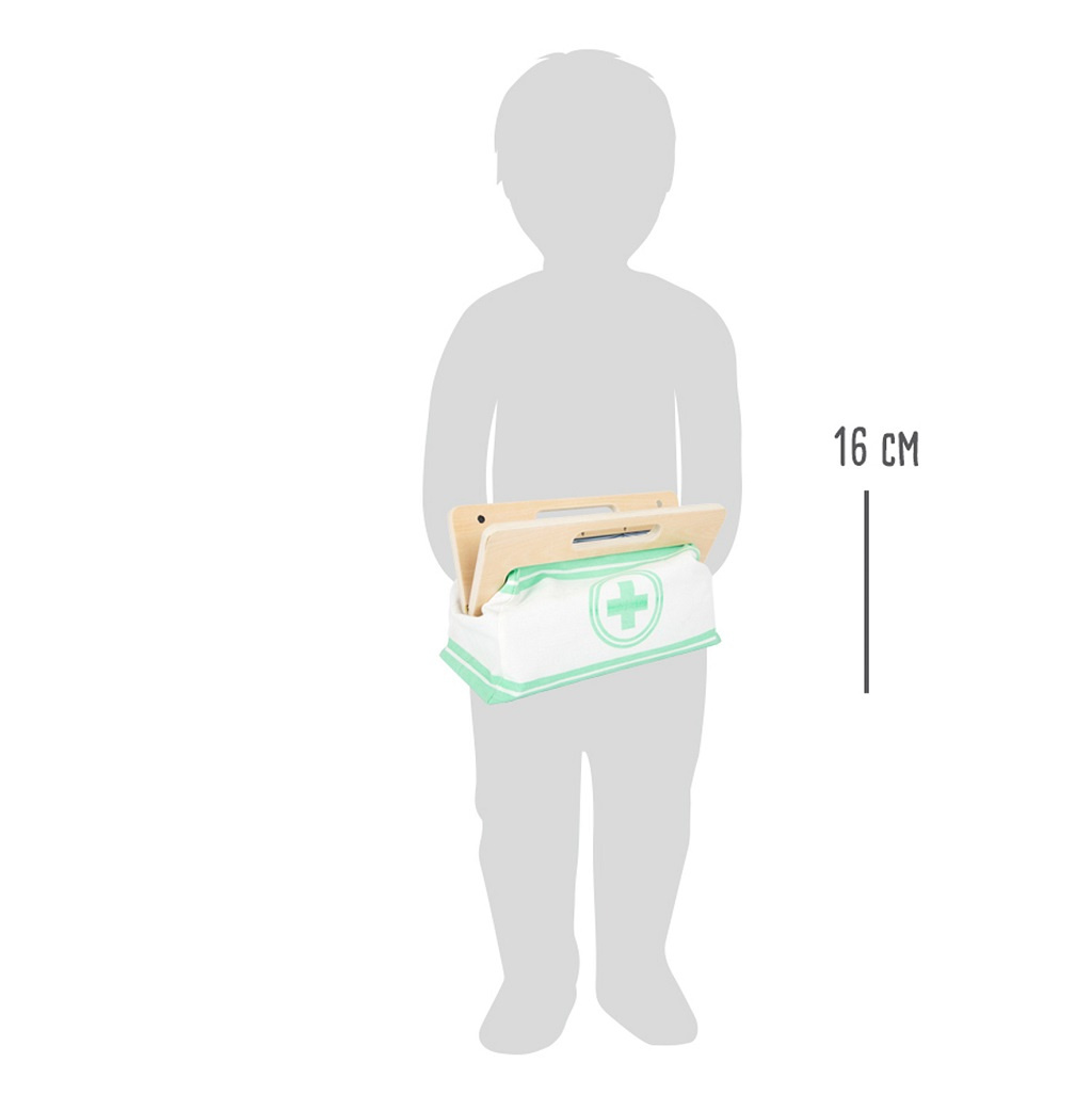 Rozměry balení: 28x15x10 cm Lékařská brašna: cca 27x13x16 cm Teploměr: cca 13 x 5 x 3 cm Věk: 3+ Materiál: dřevo, látka