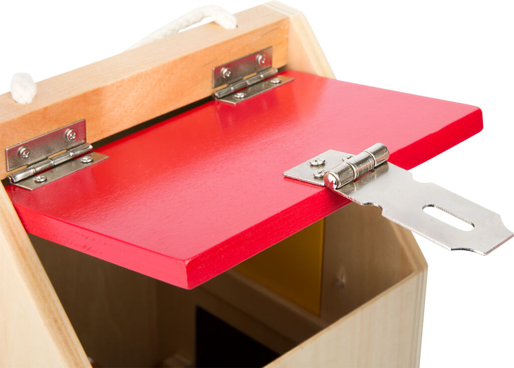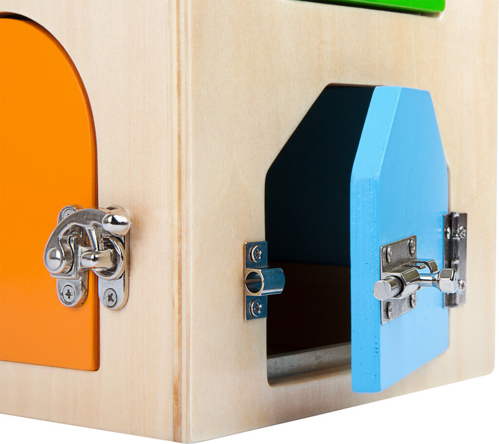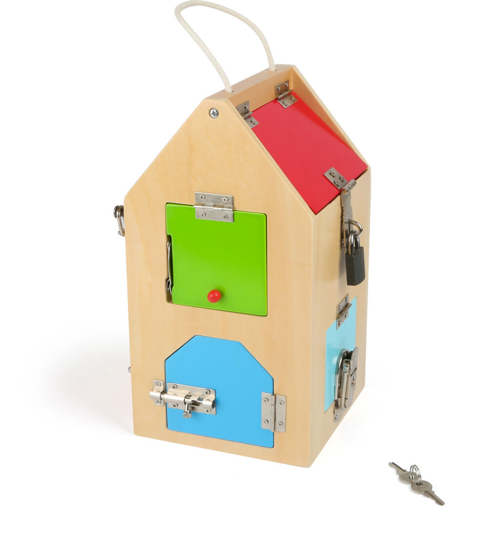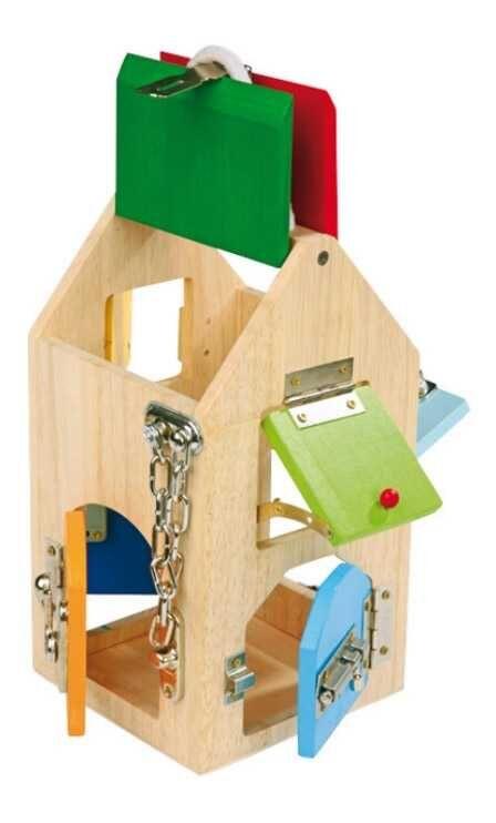Na tomto dřevěném domku s vysoce kvalitním zpracováním nejdete U zámek a cylindrický zámek, různé šrouby, páky, panty a bezpečnostní řetěz, které trénují motoriku dětí. Navíc se velmi snadno přepravuje a zajišťuje "klíčové" zážitky! Vyroben z odolného dřeva a pevných kovových částí.