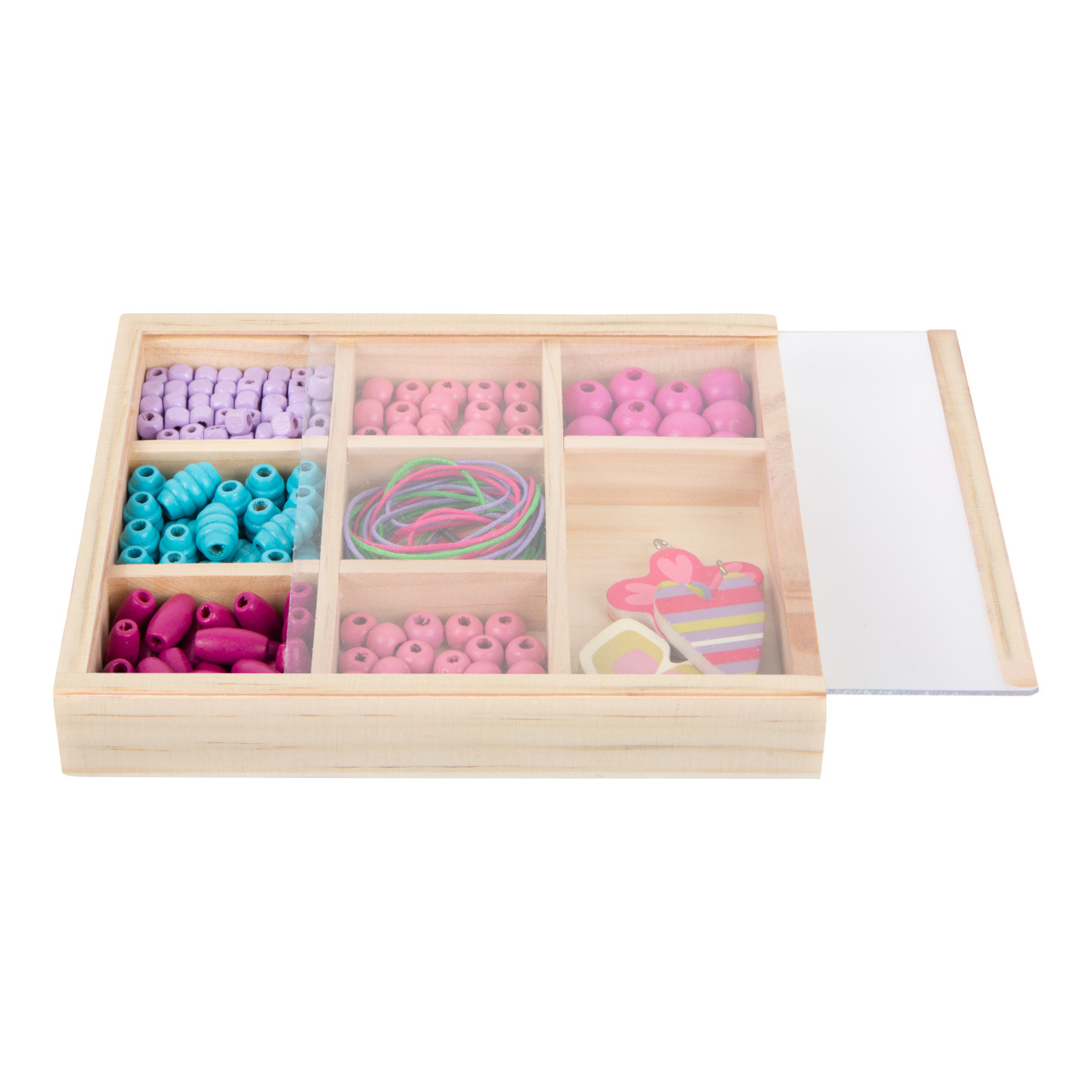 Vyrobte si své šperky s touto sadou korálků v pěti různých barvách a tvarech. Korálkový set doplňují tři přívěsky s různými motivy v hravém designu a tři barevně sladěné šňůry. Vše je uloženo v dřevěné krabici. Navlékáním korálků je podporována jemná motorika dětí.