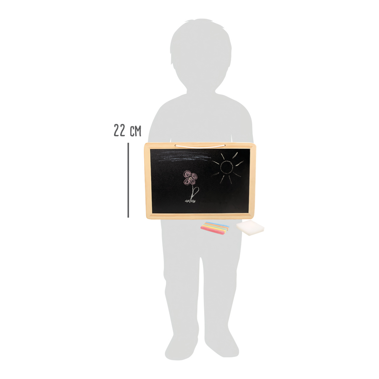 Tato nostalgická tabule je vhodná pro malé poznámky a kreativní kreslení. Tabule se dá pověsit, obsahuje barevné křídy a houbu.