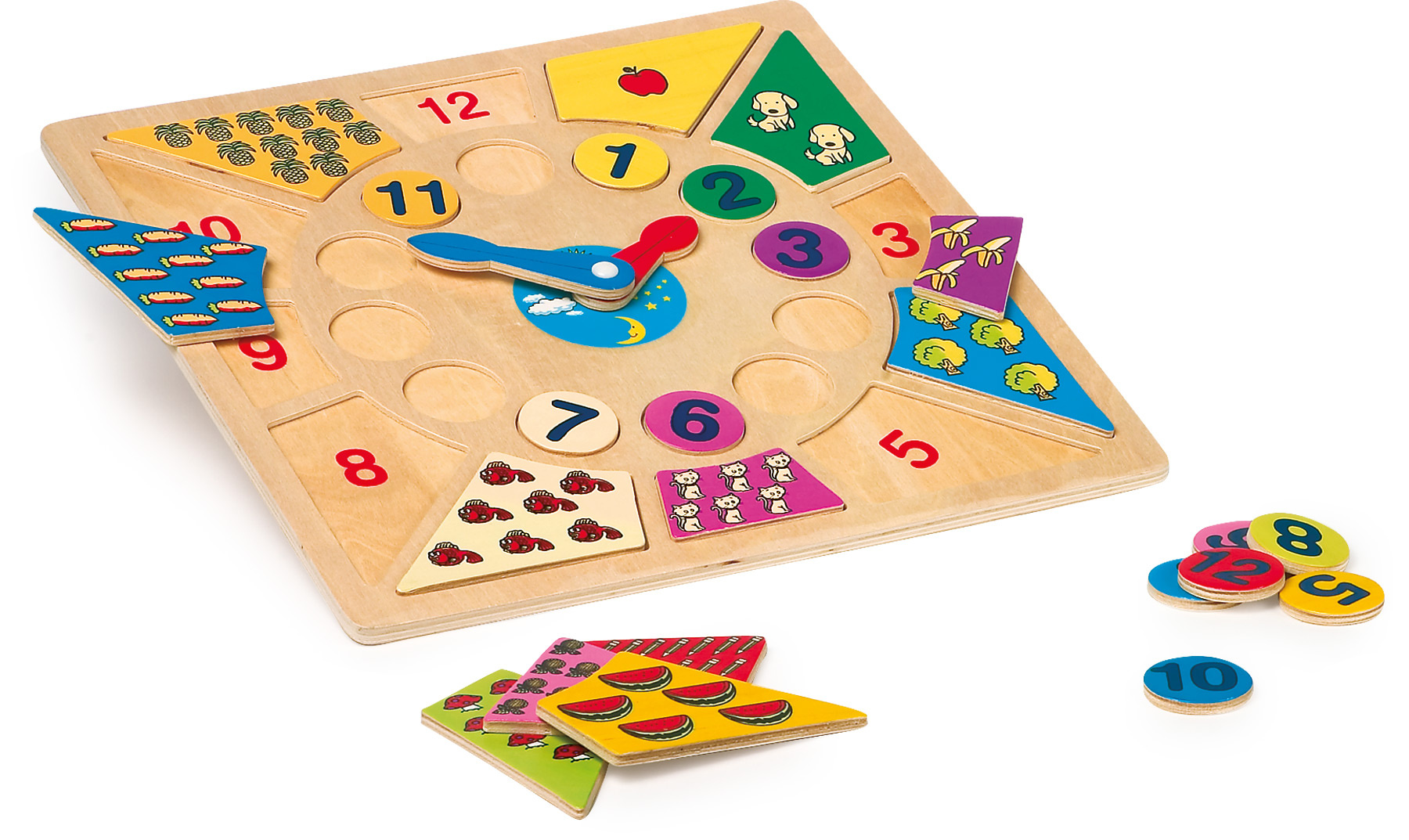 Půl deváté? Za deset deset? S touto barevnou hračkou se děti jednoduše naučí poznávat čas a užijí si při tom spoustu zábavy. Dřevěné dílky s číslicemi můžete z hrací desky vyjmout a poté opět vložit zpět, ale se správně seřazenými časy a množstvím. Skvělá hračka pro předškolní i školní děti, která jim pomůže s učením čísel. Bude se hodit do každého dětského pokoje.