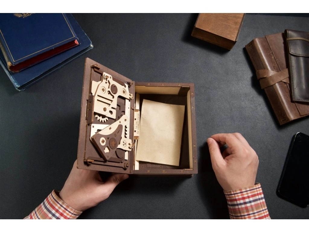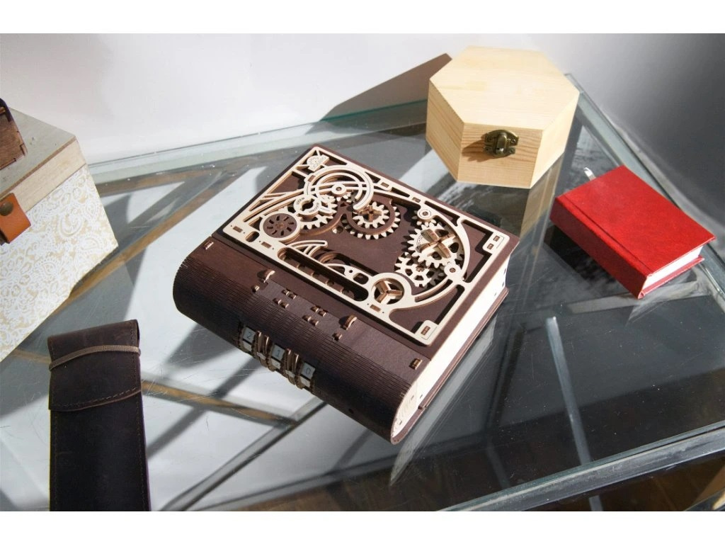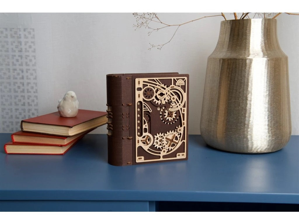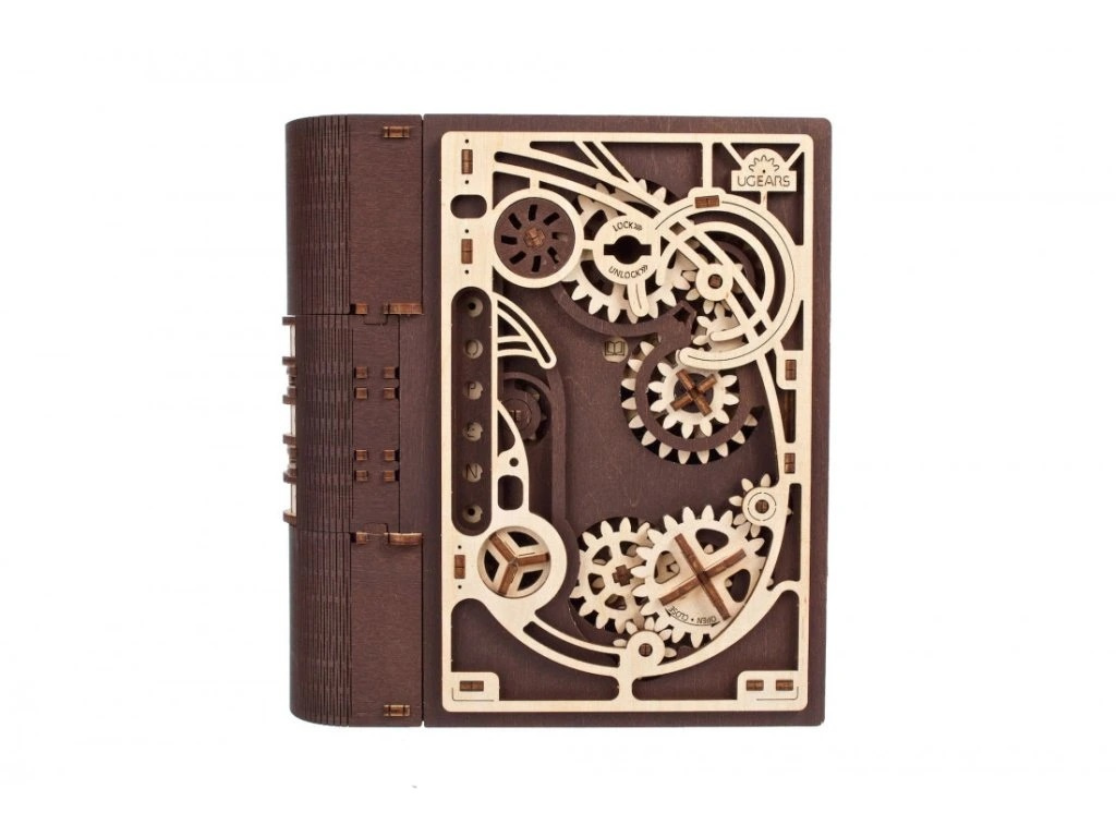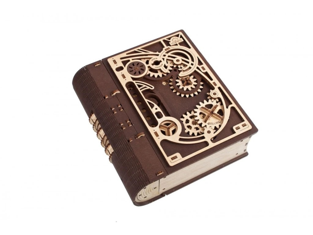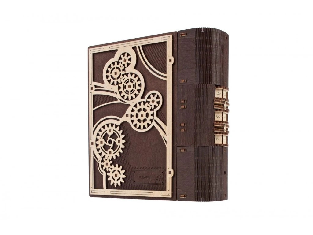 Knihy byly používány k ukrývání předmětů téměř tak dlouho, co existují. Do knihy vyhloubíte otvor, schováte svou cennost a knihu uložíte na polici mezi další svazky a nikdo kromě Vás nepozná, že je něčím vyjímečná. Stavebnice knihy, která je zároveň skrýší na tajnosti, je vyrobena z překližky. Po sestavení se kniha promění ve funkční schránku, do které můžete vložit své poklady nebo vzkaz pro někoho blízkého, protože tato zdobená kniha může být i netradičním a zábavným dárkem a bude se báječně vyjímat na polici. Kombinace přírodního a tmavého dřeva spolu s originálními a funkčními pohyblivými detaily jako jsou ozubená kola na přední straně nebo číselník na hřbetu knihy přispěje k nezapomenutelnému zážitku při sestavování. Knihu otevřete pomocí třímístného kódu na hřbetu knihy a otočením klíče a ozubených koleček anebo i bez toho, že byste věděli číselnou kombinaci. Puzzle je vybaveno detailním návodem k sestavení, a to bez použití lepidla.