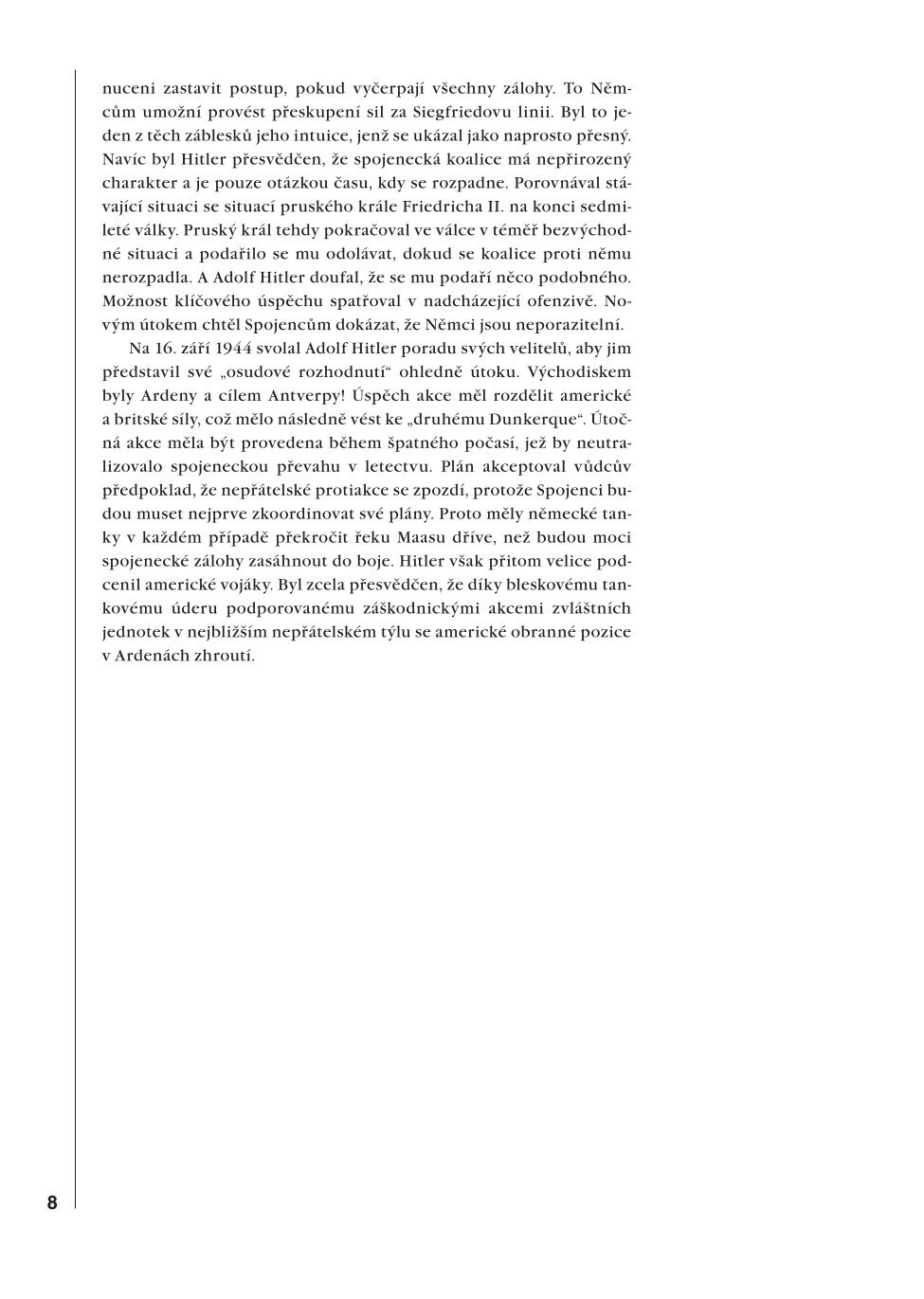 Bitva v Ardenách, kterou Američané označují jako "bitvu o výběžek", byla posledním vážným německým pokusem zvrátit zoufalou situaci na západoevropském válčišti. Tři německé armády tu prorazily slabou americkou obrannou linii a snažily se proniknout náročným horským terénem k řece Maase. Jejich pečlivě naplánovaný postup však byl nejprve zpomalen a posléze zcela zastaven - na jižním (prostor Bastogne) i na severním křídle. Američané dokázali zmobilizovat veškeré možné síly a německý útok nakonec zastavili. Publikace Jamese Arnolda podrobně ukazuje, kdy se německá šance na vítězství změnila v jednoznačnou německou porážku.