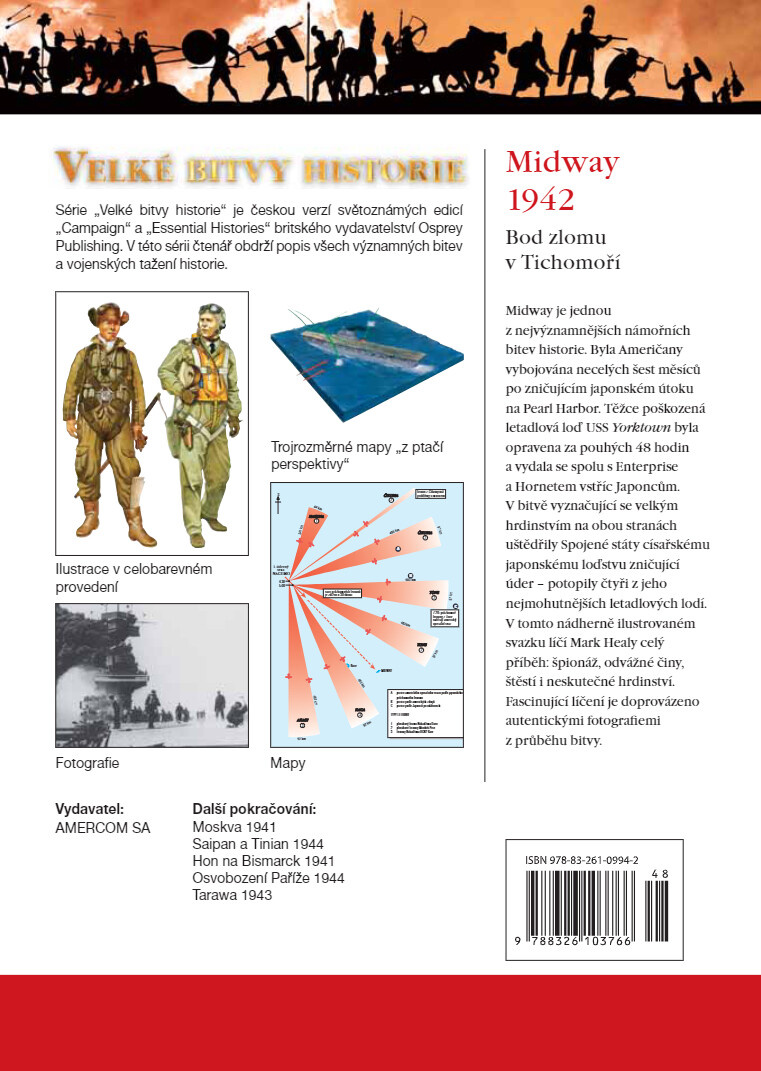 Midway je jednou z nejvýznamnějších námořních bitev historie. Byla Američany vybojována necelých šest měsíců po zničujícím japonském útoku na Pearl Harbor. Těžce poškozená letadlová loď USS Yorktown byla opravena za pouhých 48 hodin a vydala se spolu s Enterprise a Hornetem vstříc Japoncům. V bitvě vyznačující se velkým hrdinstvím na obou stranách uštědřily Spojené státy císařskému japonskému loďstvu zničující úder - potopily čtyři z jeho nejmohutnějších letadlových lodí. V tomto nádherně ilustrovaném svazku líčí Mark Healy celý příběh: špionáž, odvážné činy, štěstí i neskutečné hrdinství. Fascinující líčení je doprovázeno autentickými fotografiemi z průběhu bitvy.