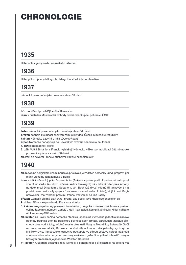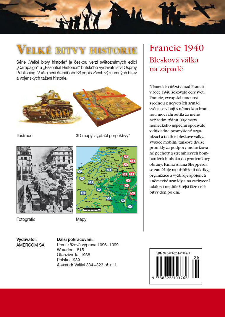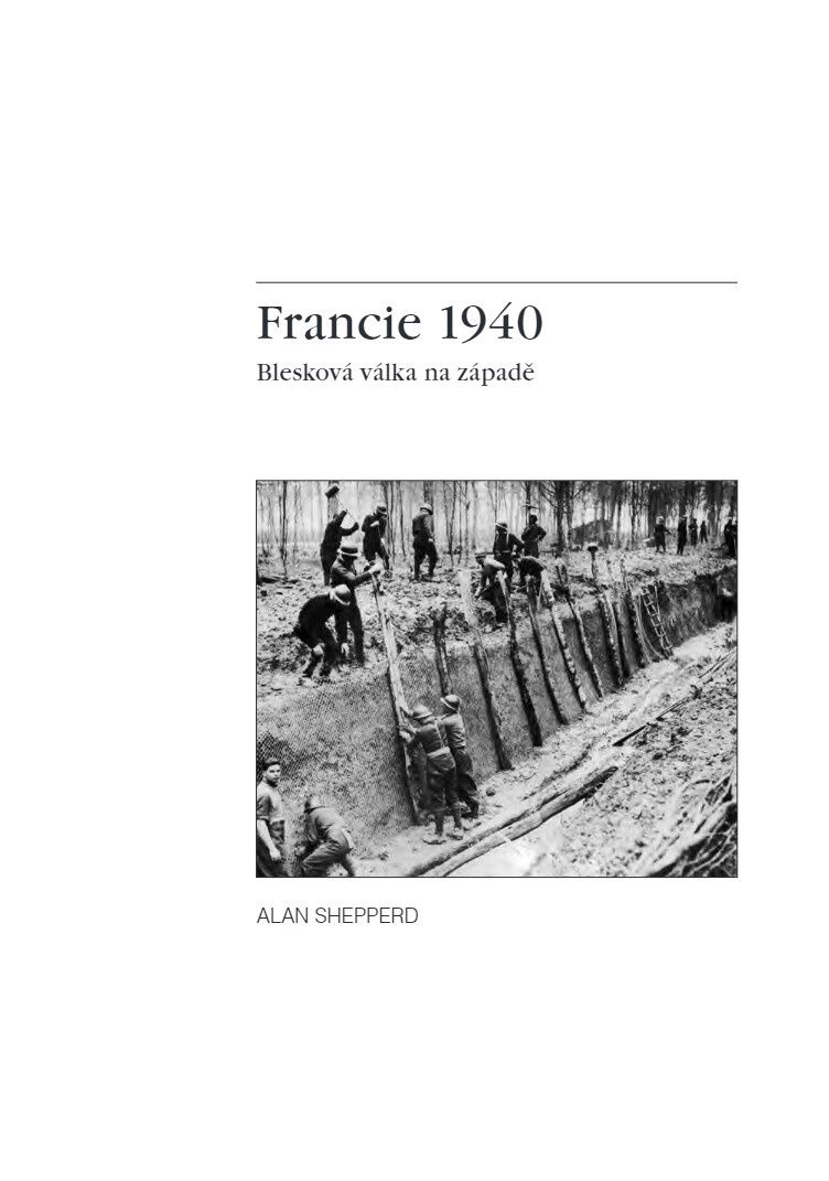 Německé vítězství nad Francií v roce 1940 šokovalo celý svět. Francie, evropská mocnost s jednou z největších armád světa, se v boji s německou branou mocí zhroutila za méně než sedm týdnů. Tajemství německého úspěchu spočívalo v důkladně promyšlené organizaci a taktice bleskové války. Vysoce mobilní tankové divize pronikly za podpory motorizované pěchoty a střemhlavých bombardérů hluboko do protivníkovy obrany. Kniha Alana Shepperda se zaměřuje na přiblížení taktiky, organizace a výzbroje spojenců i německé armády a na zachycení událostí nejdůležitější fáze celé bitvy den po dni.