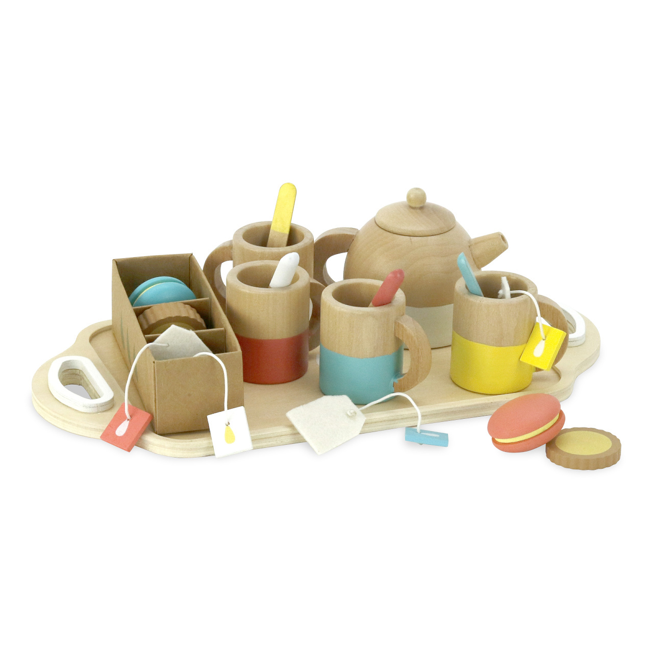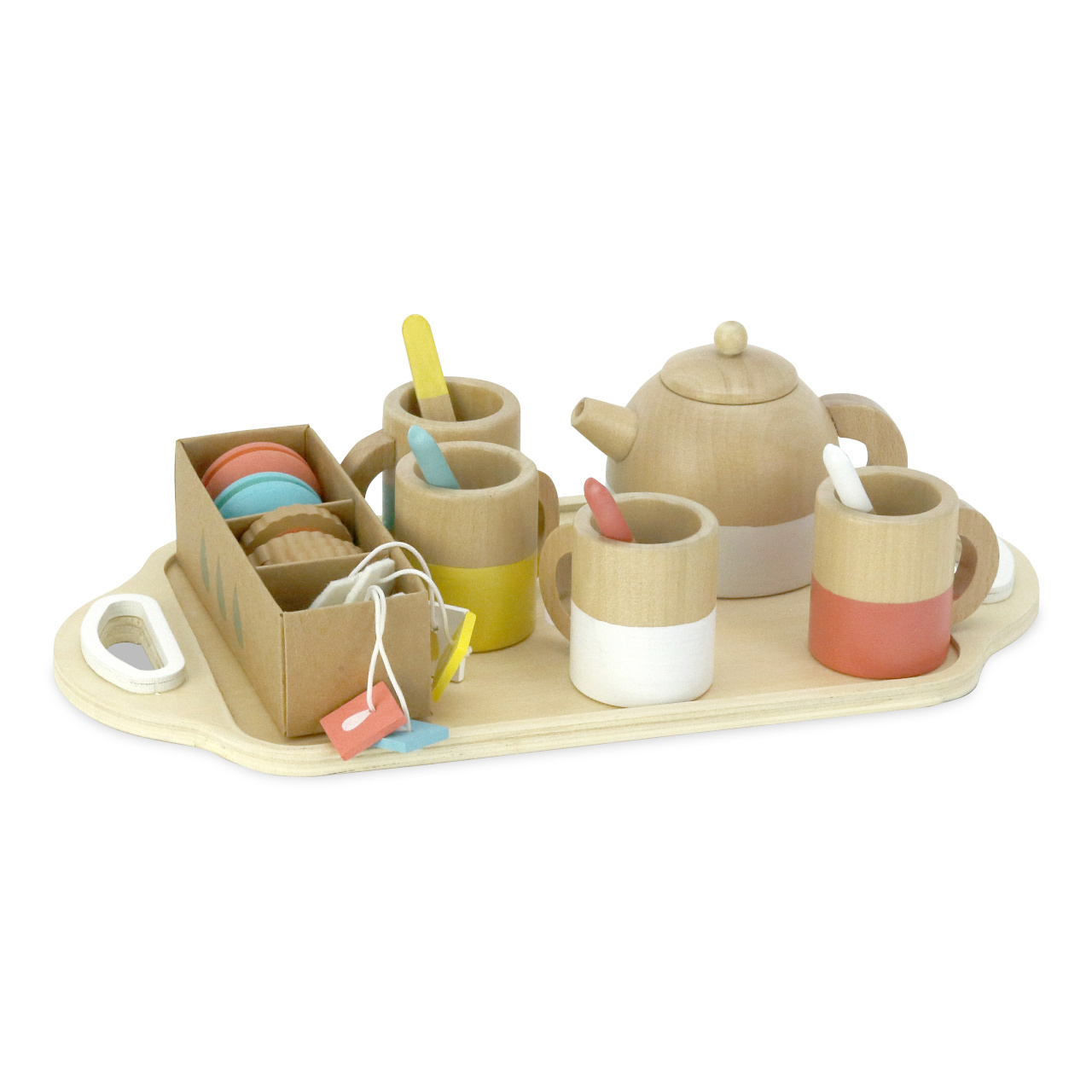Čas na čaj! Děti budou rády pozívat své plyšové hračky ke hře s touto hezkou dřevěnou čajovou soupravou v jemných barvách. Dali byste si jahodový koláč? A ty malá panenko, chtěla bys makronku namočit do čaje? Souprava obsahuje: 4 šálky, 4 lžíce, 1 konvice, 4 čajové sáčky, 2 makronky, 4 sušenky v krabičce a 1 podnos.