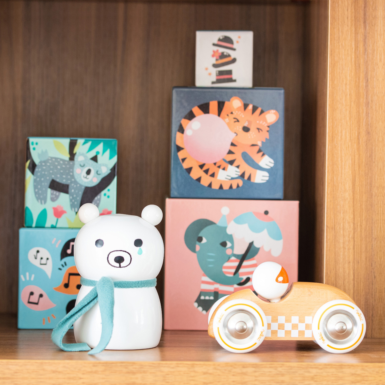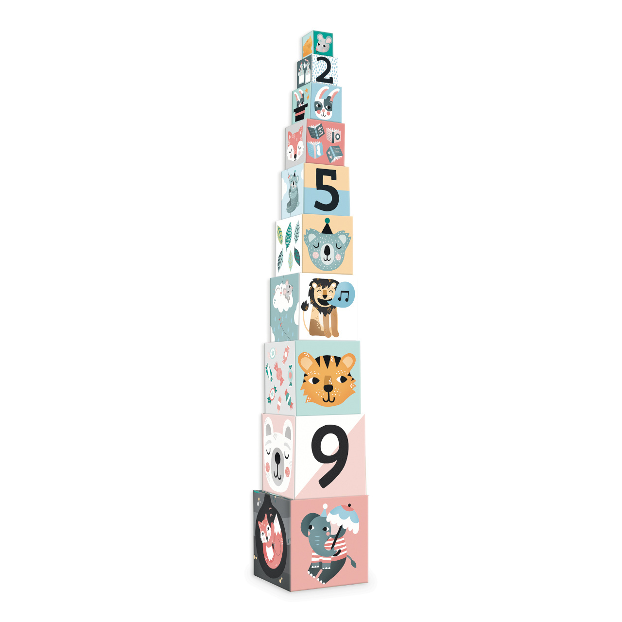 Deset kartonových skládacích kostek s krásnými ilustracemi Michelle Carlslund. Děti se při hraní naučí jak skládat kostky, tak rozpoznávat zvířata, barvy a počty. Rozvíjí koordinaci ruka-oko, a tím celkovou zručnost dětí.